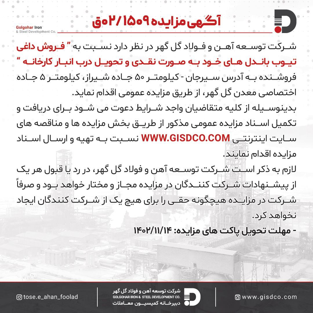 آگهی مزایده ۰۲/۱۵۰۹ مزایده فروش داغی تیوب باندل ها شرکت توسعه آهن و فولاد گل گهر