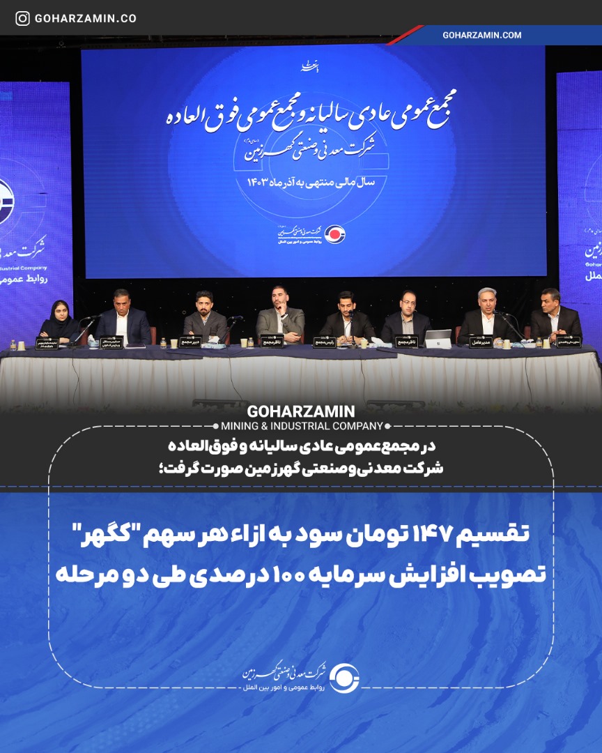 مجمع‌عمومی عادی سالیانه سال مالی منتهی به ۳۰ آذر ۱۴۰۳ و مجمع‌عمومی فوق‌العاده شرکت معدنی‌و‌صنعتی گهرزمین با حضور بیش از ۹۴درصد سهامداران صبح امروز در هتل المپیک تهران برگزار شد و تقسیم ۱۴۷تومان سود به ازاء هر سهم به تصویب حاضرین رسید.