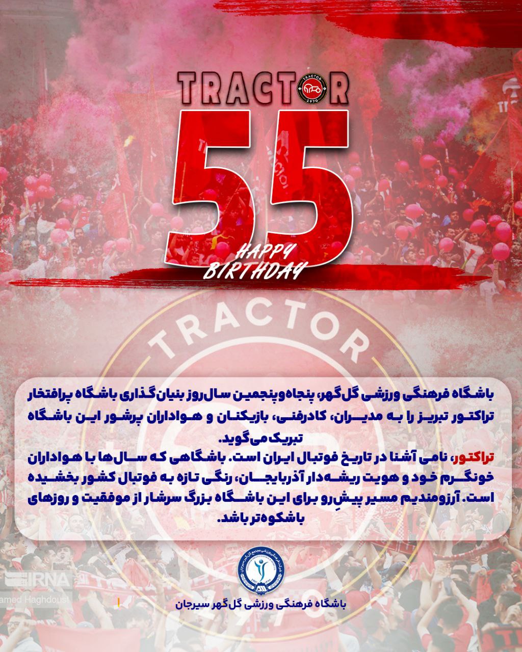 باشگاه فرهنگی ورزشی گلگهر، پنجاهوپنجمین سالروز بنیانگذاری باشگاه پرافتخار تراکتور تبریز را به مدیران، کادرفنی، بازیکنان و هواداران پرشور این باشگاه تبریک میگوید.